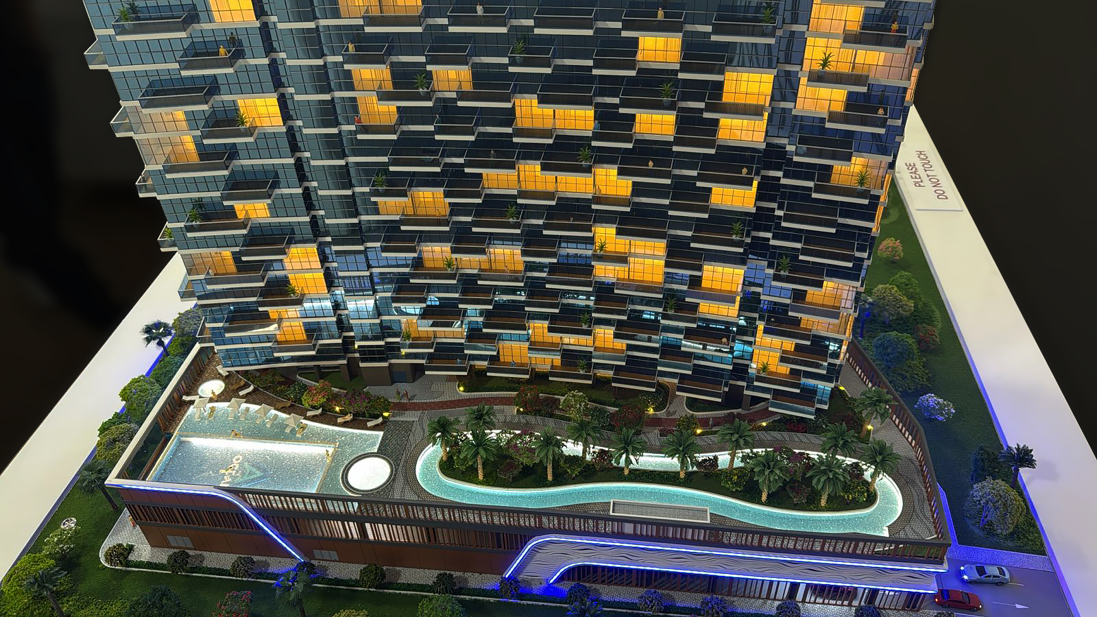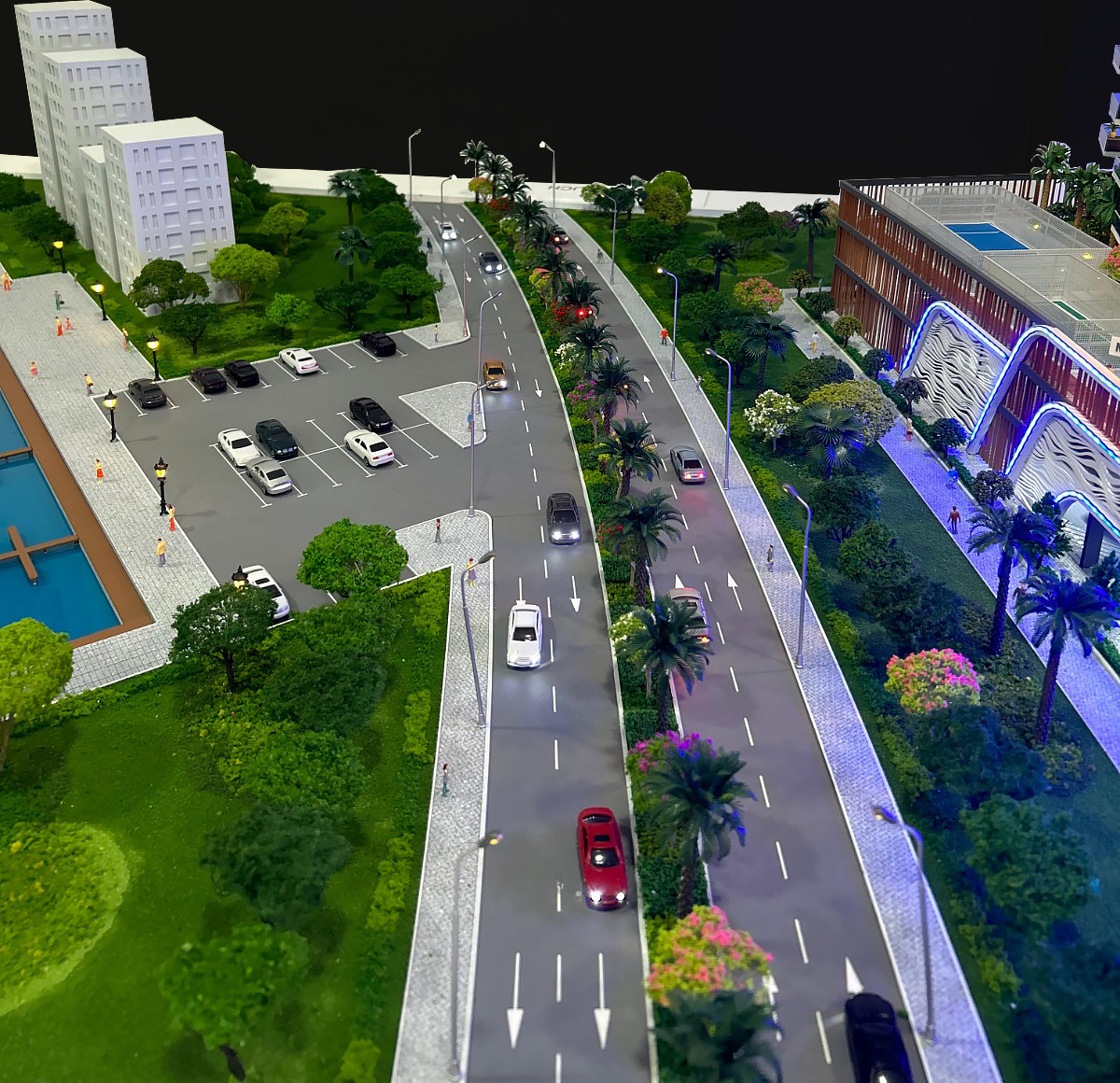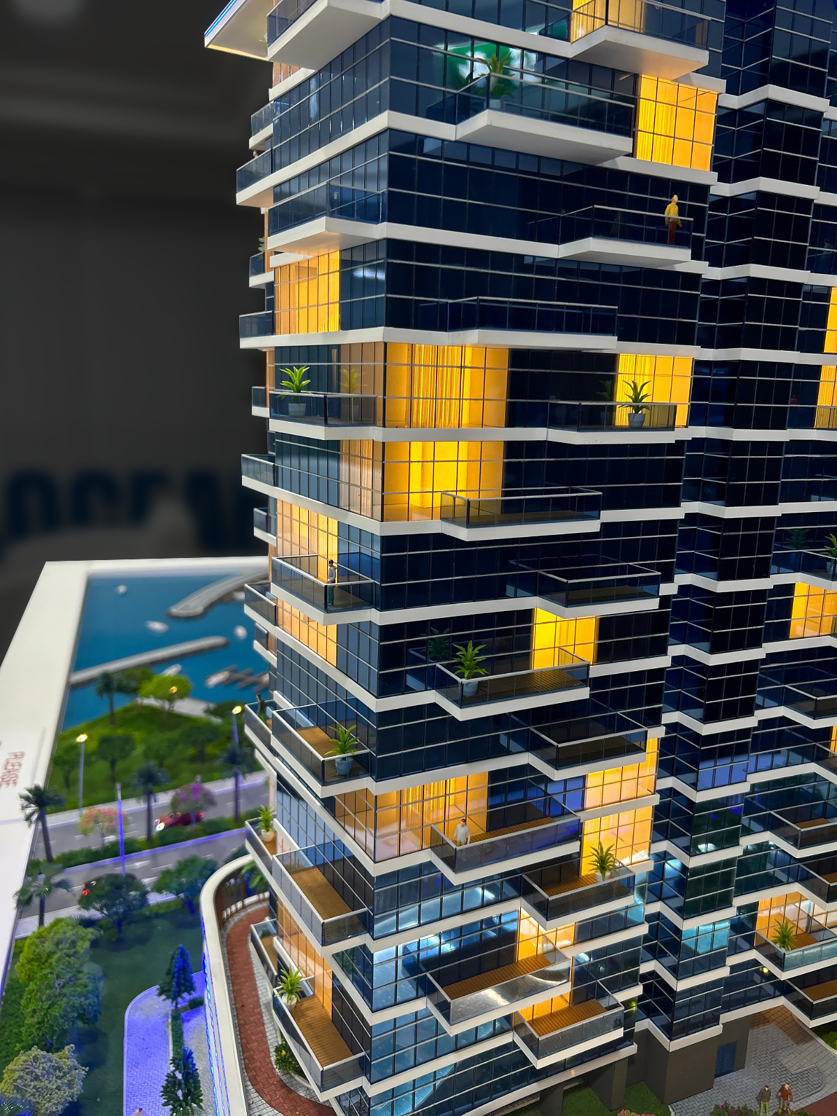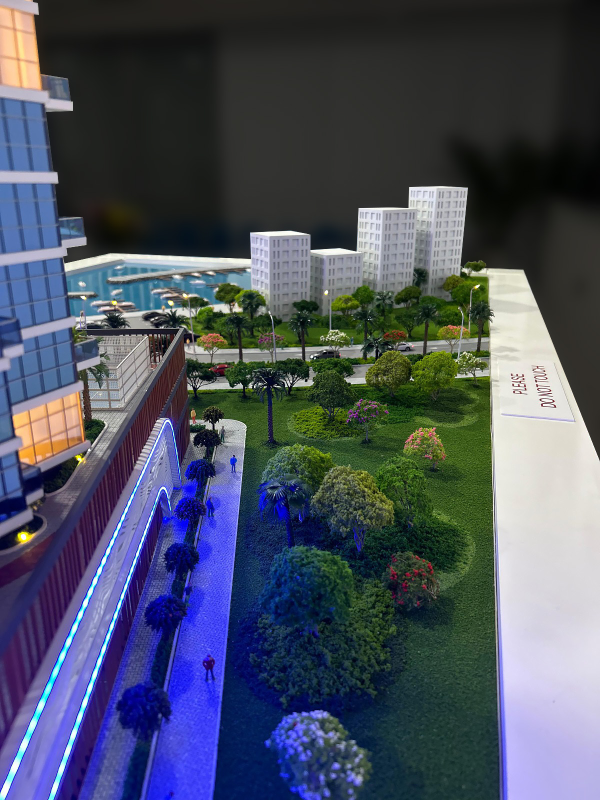 The Ocean Tower model, created for Dubai-based Ansari Real Estate Development, stands as a benchmark in high-end architectural presentation modeling. Designed to reflect the sleek, modern design of this high-rise coastal development, the model was constructed using CNC laser cutting and 3D printed components to ensure precise architectural detailing. To bring the surrounding urban environment to life, we integrated imported 3D palm trees, planters, and scaled die-cast cars that matched the tower’s scale, enhancing realism and visual depth. The achievement of this model lay in its seamless wireless LED lighting system, allowing remote-controlled activation and zone-based illumination, which created a striking and flexible visual experience during presentations and events.