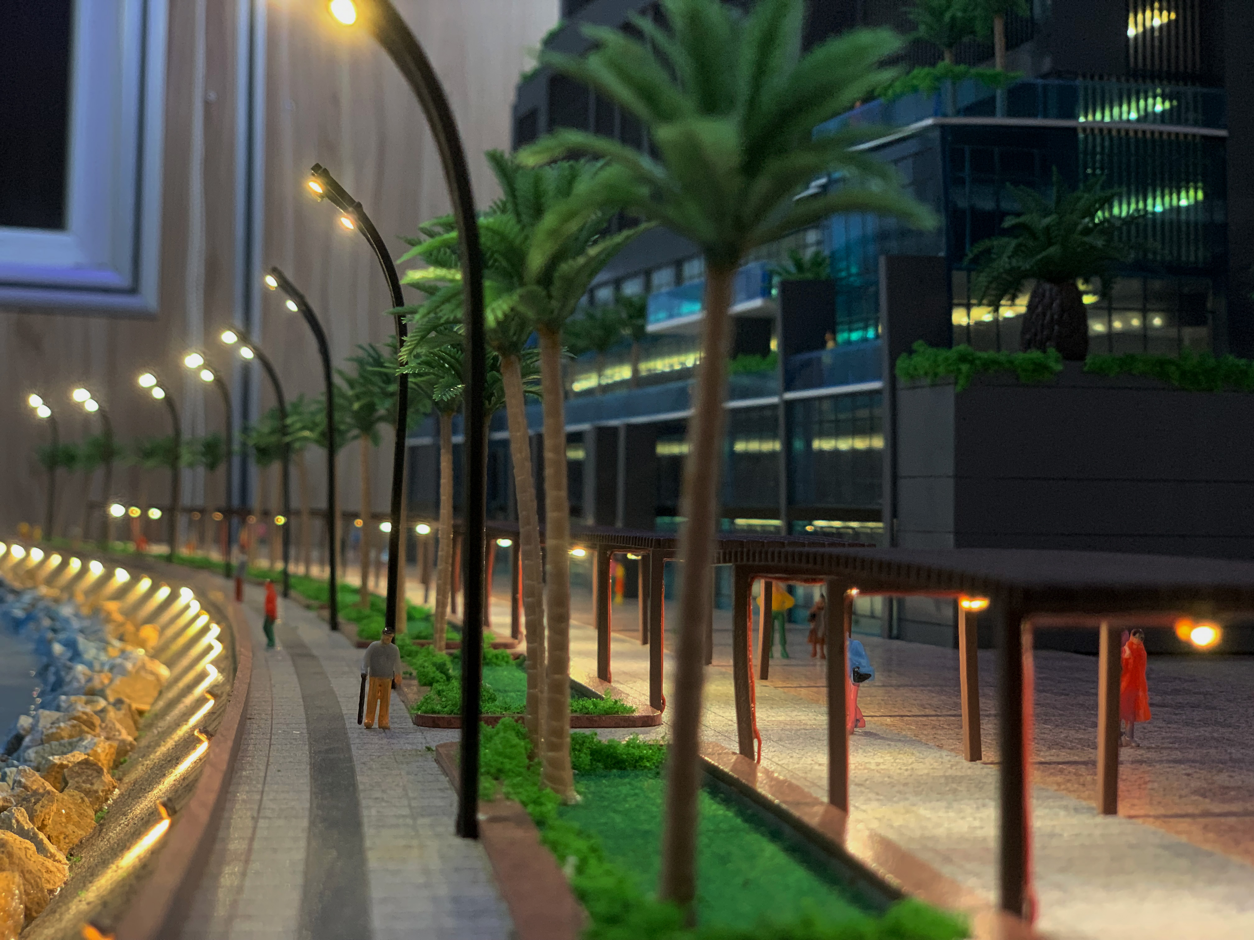 Advanced technology was employed throughout the process to elevate both the form and function of the display. Fluorescent LED lighting was installed with a diffused layout to ensure smooth, glare-free illumination across the model, enhancing its visual appeal in both daylight and low-light conditions. This lighting system added a dynamic edge to the presentation, softly highlighting building contours and site layout. High-precision CNC laser cutters and 3D-printed STL components were used to capture complex structural elements, ensuring architectural accuracy. The result was a refined, visually impactful model ideal for client presentations, on-site marketing, and investment showcases.